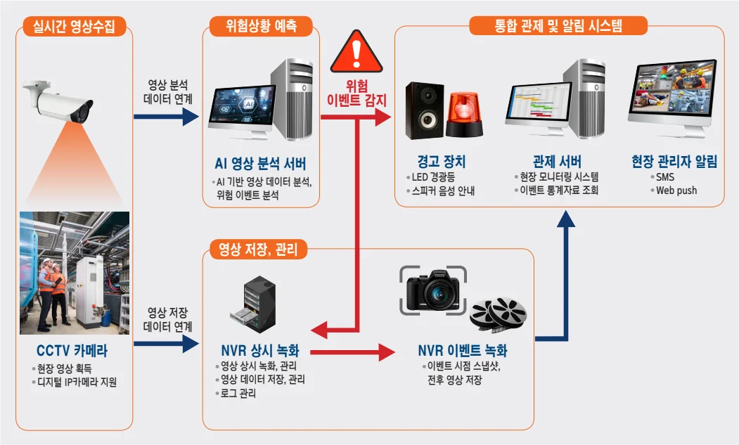 AI 카메라로 산업현장을 실시간 모니터링하여, 딥러닝 영상분석 기술로 위험상황을 신속하게 감지하는 작업자 안전사고 예방 지능형 안전 솔루션